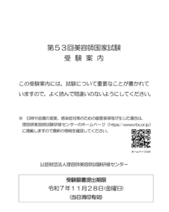 第52回 美容師国家試験 筆記試験について、当日の受験に関する重要事項をお知らせいたします。 受験される方は、必ず事前にご確認ください。 1. 試験の進め方(集合時間・試験時間) 【通常受験者】 (実技試験と筆記試験の両 […]